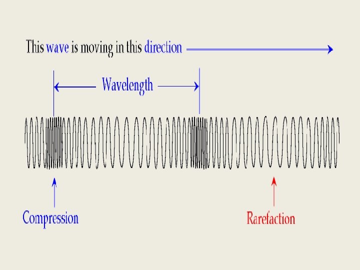 Parts of a Compression Wave • 1. Compression- Where the particles are pushed together. • 2. Rarefaction- Where the particles are spread apart. • 3. Wavelength- The distance between two compressions or two rarefactions.