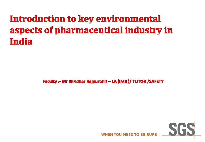 REGULATIONS AT STATE LEVEL n Enforcement at STATE LEVEL : n State Level Factory Rules -1963 and further amendments n Pollution Control Board Consent To operate – a) WATER ACT 1974 , b) AIR ACT -1984 n Stack Monitoring Reports for emissions to Air n Work Environment monitoring – Ventilation , Illumination , Dust & fumes n Noise Monitoring n Formation of SAFETY COMMITTEE as per 73 L 11