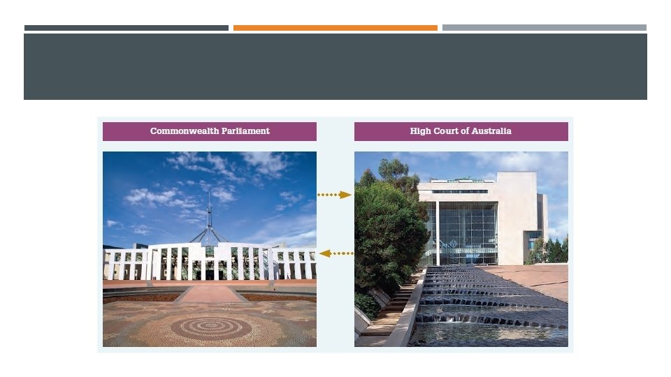 PARLIAMENT CAN CHANGE OR CONFIRM LAW MADE BY THE COURTS Courts depend on parliament to make the bulk of the law. Parliament depends on courts to apply the law made by parliament and to establish new law on situations that have arisen for the first time. Parliament can confirm a precedent made in court by passing an act that reinforces the principles established by the court. Parliament can also change the law to override a decision made through the courts (other than High Court interpretations of the Constitution). Why? Courts sometimes don’t reflect intention through their interpretations and/or the interpretations don’t reflect current meaning. Courts also sometimes interpret the common law (made up of precedents set in the past) in a conservative way that no longer reflects current values in the community.