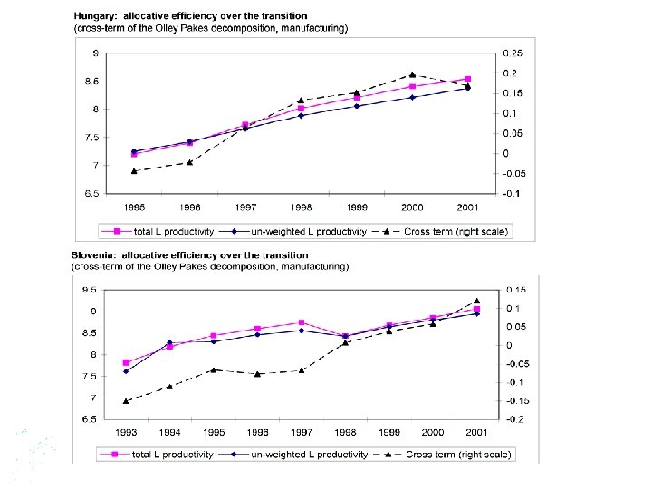 Reallocation and productivity l l Frictions impede reallocation to most productive firms Frictions affect ‘selection’ of firms l Who will enter, who will exit l ‘Olley-Pakes cross-term’ measures the effect