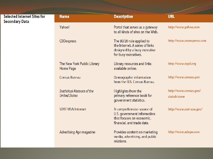 THE INTERNET Today, of course, much secondary data is conveniently available over the Internet. Its creation has added an international dimension to the acquisition of secondary data. For example, Library Spot, at http: //www. libraryspot. com, provides links to online libraries, including law libraries, medical libraries, and music libraries. Its reference desk features links to calendars, dictionaries, encyclopedias, maps, and other sources typically found at a traditional library’s reference desk.