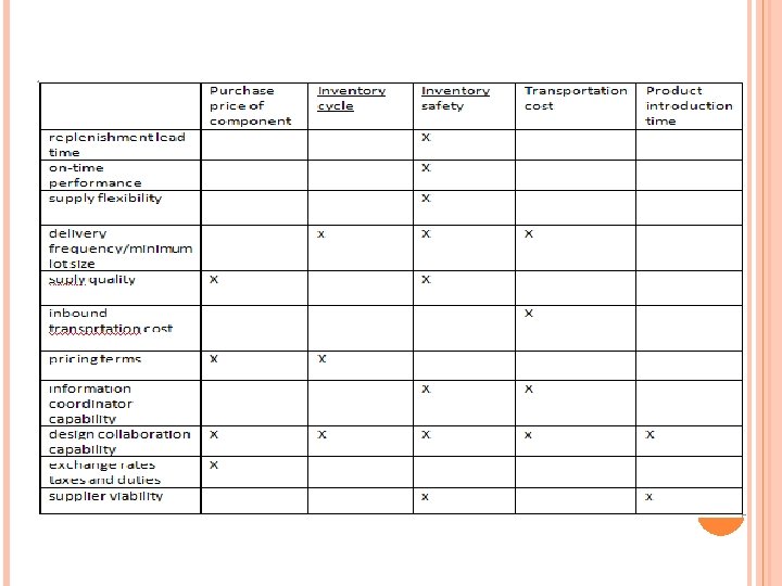 SUPPLIER SCORING AND ASSESSMENT Ketika menskor dan menakasir supplier, ada faktor lain daripada kuota harga yang harus dipertimbangkan: pemenuhan lead time, performa on-time, fleksibelitas pasokan, frekuensi pengiriman/minimum lot size, kualitas pasokan, biaya transportasi inbound, pricing term, kapabilitas koordinasi informasi, kapabilitas kalaborasi desain, tingkat bunga, pajak dan tugas, kelangsungan hidup supplier.