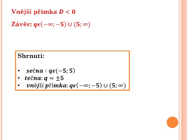 Tentokrát řešíme kvadratickou nerovnici, pomůžeme si číselnou osou, na které znázorníme hodnoty parametru q. -5 0 5 Vybereme libovolné číslo q, z výše uvedených intervalů Toto číslo dosadíme do nerovnosti a vypočítáme