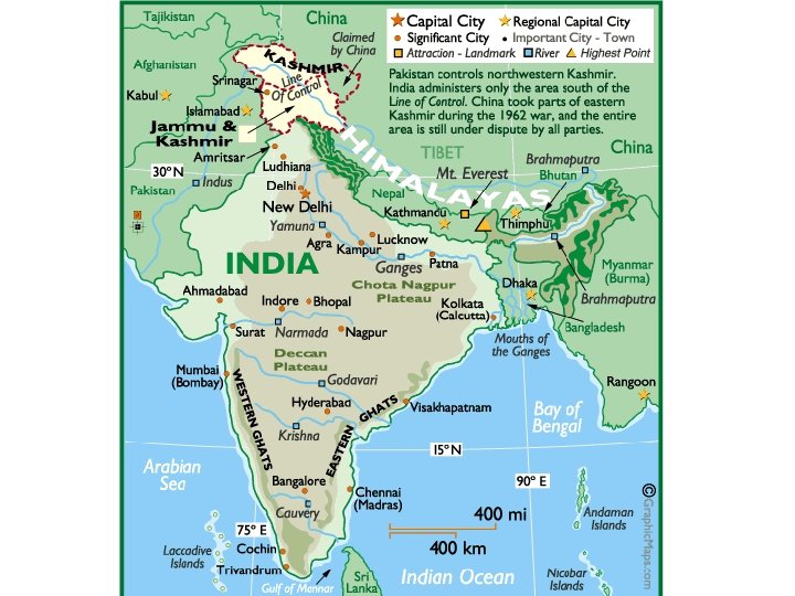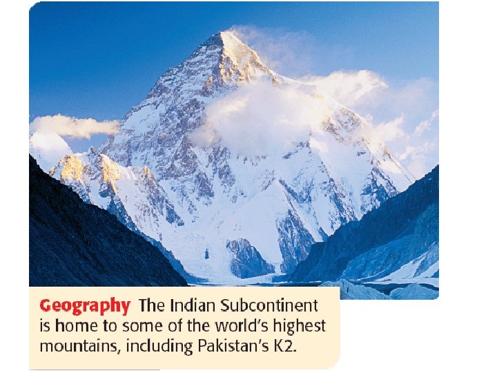 INDIA: Mountains • Alpine system: The Himalayas form a major barrier to the movements of air masses north and south and exceed 6, 096 m (20, 000 ft) in several locations. – Mount Everest (Nepal: Sagarmatha; Tibetan: Chomolungma) is the world’s highest mountain at 8, 848 m (29, 035 ft). – The climate ranges from tropical lowlands to Arctic conditions in the high altitudes of Mount Everest and other peaks. – The Karakoram Pass provides access from north-central India through the Himalayan and Hindu Kush mountains. – The Khyber Pass in the west was used by invading groups. – Population in the Himalayas is limited except in the Vale of Kashmir and in Nepal (25, 200, 000 people). – Bhutan has 900, 000 and Sikkim less than one million. Sikkim has been incorporated into India and is one of its provinces. – Rice and wheat are the dominant grain crops.