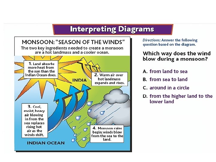 • A monsoon is a strong wind that blows one direction in winter and the opposite direction in summer. Monsoons bring rain in summer.