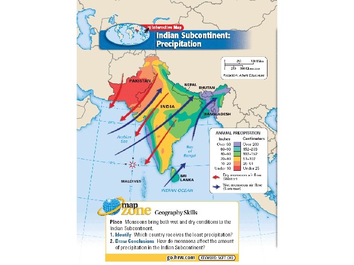 Climate Regions 1. Highland climate – Himalayas – Brings cool temperatures to much of Nepal and Bhutan 2. Humid subtropical climate – Plains south of the Himalayas – Hot, humid summers with plenty of rainfall 3. Tropical climate – Covers much of the subcontinent – Tropical savanna in central India and Sri Lanka – Humid tropical climate in southwest India, Sri Lanka, Maldives, and Bangladesh 4. Desert and steppe climate – Throughout southern and western India and most of Pakistan – Dry