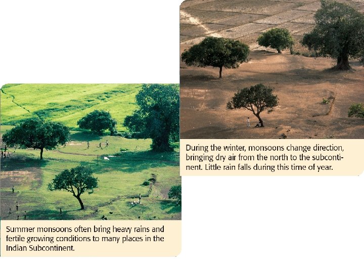 India’s Climate • India's climate is dominated by monsoons. Monsoons are strong, often violent winds that change direction with the season. • Monsoon winds blow from cold to warm regions because cold air takes up more space than warm air. • Monsoons blow from the land toward the sea in winter, and from the sea toward land in the summer.