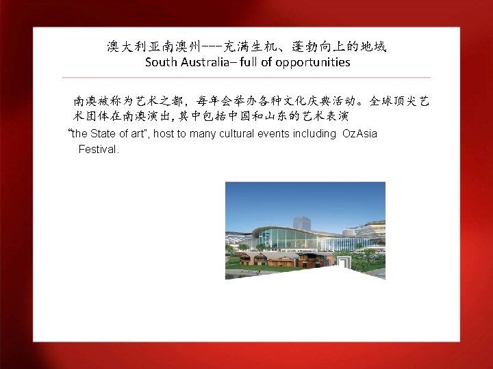 澳大利亚南澳州---充满生机、蓬勃向上的地域 South Australia– full of opportunities -- 艺术及体育Arts and Sports 山东已派出“红高粱”、“聊斋”等艺术团体参加南澳艺术节 并派出雕塑家及知名画家访问南澳 鲁能足球多次与南澳足球比赛,2016年举办篮球和板球比赛 2018年山东省自行车协会与南澳自行车协会签署合作备忘录 more than 100 artists have visited SA and sports exchanges are increasing including football, basketball and cricket etc. Mo. U between Cycling SA and SD Cycling Federation on youth racing and training signed in 2018 10