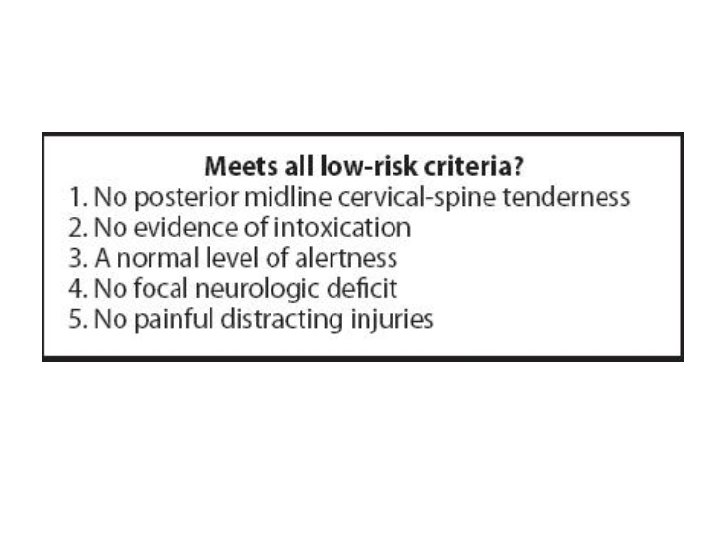 30 yo Fall • 30 -year-old male presents to the emergency department with right wrist pain. He states that he felt proximally 10 feet off of a ladder landing on his right hand. He denies head injury or loss of consciousness. He complains of mild neck stiffness and was placed in a cervical collar in triage. • VS: T 37. 2, P 78, RR 18, BP 150/92, SAT 98% on RA • PE: – Well-developed male with a 5 o’clock shadow – Right wrist swelling with a mild deformity. No lacerations. Neurovascular intact. – No midline cervical spine process tenderness or step offs.