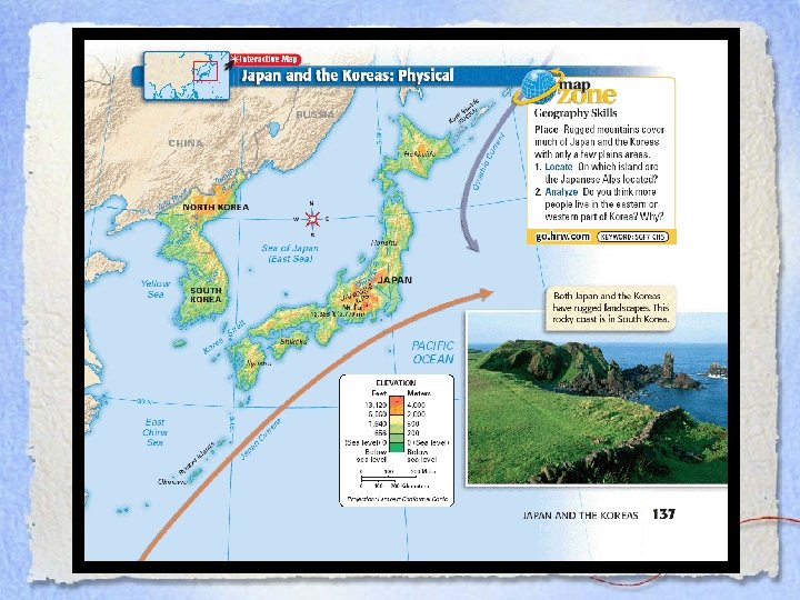 The main physical features of Japan and the Koreas are rugged mountains. Japan • Four large islands, 3, 000 smaller islands • Major islands: Hokkaido, Honshu, Shikoku, and Kyushu • Mountains cover 75 percent of the country. • Largest mountain range is called the Japanese Alps. • Fuji is Japan’s tallest mountain and has become a symbol of Japan.
