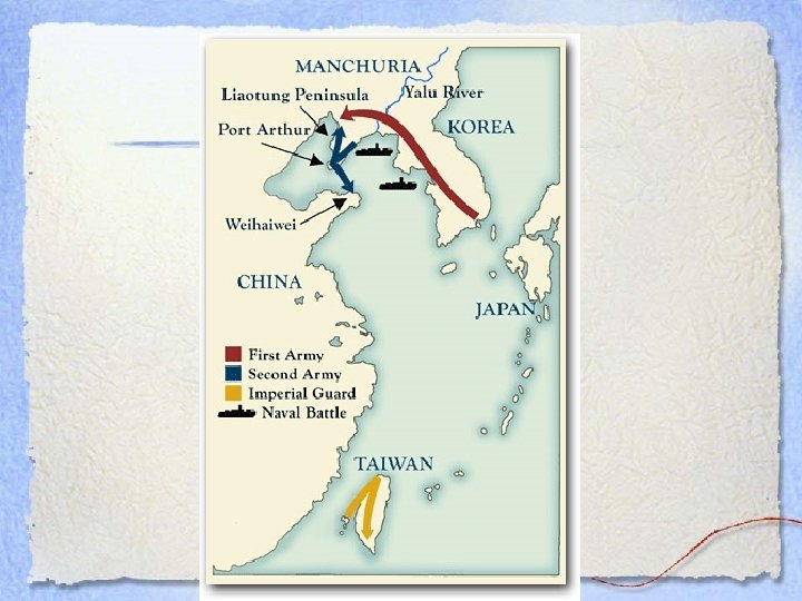 Sino- Japanese War 1876 • Japan vs. China – o. Like western countries, Japan forced Korea to open up ports but China protested both agreed not to fight but China sent in troops and Japan responded and defeated China easily » Got control of Taiwan and other islands