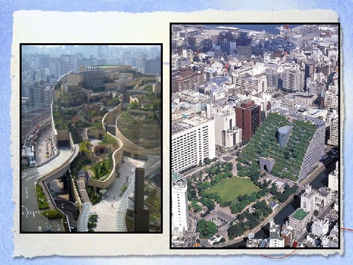 Inventive methods are used to maximize space. Houses are small and are built very close together with narrow streets. There are sound walls built around housing to block traffic noise. Stores are constructed on the tops of roofs to increase available land for farming. Malls are located underground as well. Most of the people live in apartments. For entertainment, people will go to driving ranges or batting cages, which are screened in.