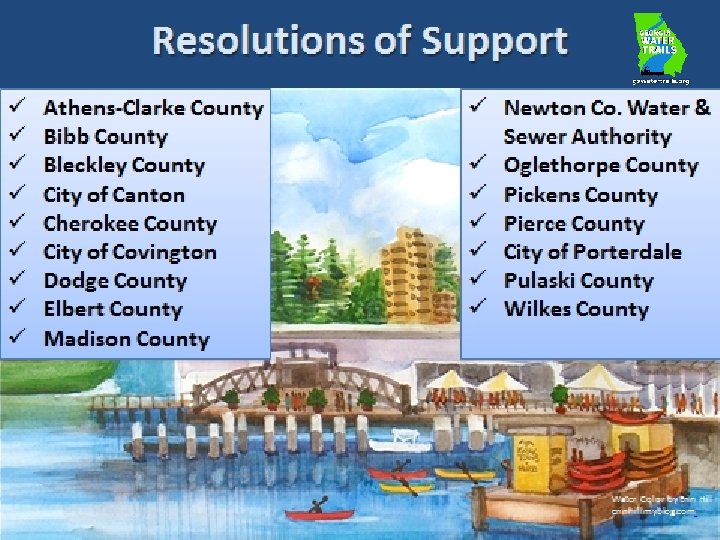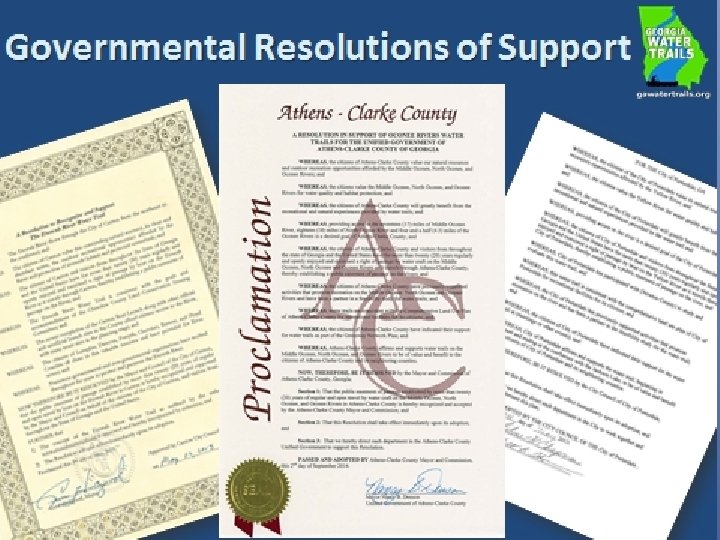 Water Trail Criteria Public access areas where paddlers can unload boats and park vehicles River access sites appropriately spaced apart for full day or 2 -3 hour paddling trips Depending on the length of the trail, water access to public overnight camping sites Water Trail information provided through website and maps Trail is sponsored, maintained and promoted by a local entity or partnership