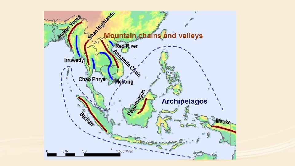 Mountains and Volcanoes • • • dominate landscape most peaks below 10, 000 feet create geographical and political barriers western and northern highlands separate region from India and China three ranges run north to south Arakan Yoma Range in western Myanmar • Bilauktaung Range between Myanmar and Thailand • Annam Cordillera separating Vietnam from Laos and Cambodia • island mountains form part of Ring of Fire • Indonesian and Philippine islands marked by craters • mineral-rich volcanic material breaks down and leaves rich, fertile soil, making Southeast Asia highly productive agricultural area •