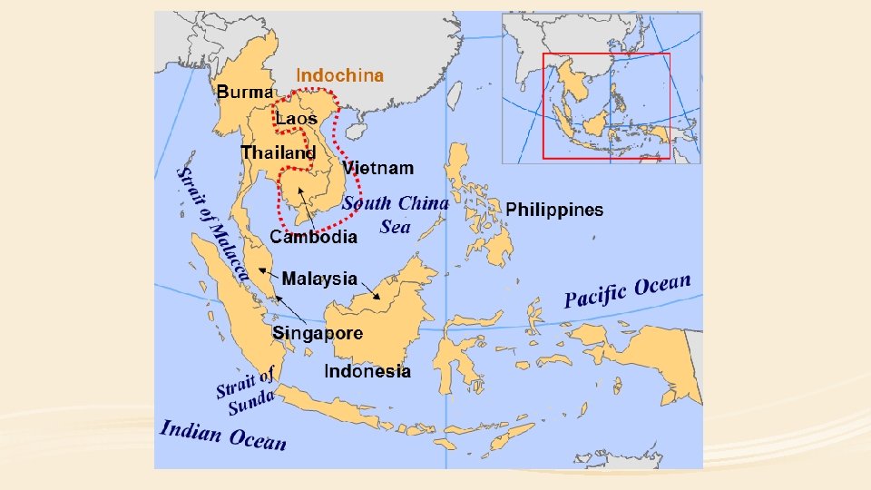 Southeast Asia • Located on the equator: • almost entire region falls within the humid tropics. • Archipelago of about 25, 000 islands • Population: 610 million • Southeast Asia is conventionally divided into two cultural, linguistic, and geographic regions: Mainland Southeast Asia - the countries of Thailand, Laos, Burma, Cambodia and Vietnam; • Insular (Island) Southeast Asia - the island or peninsular countries of Malaysia, Singapore, Brunei, the Philippines, East Timor, and Indonesia •