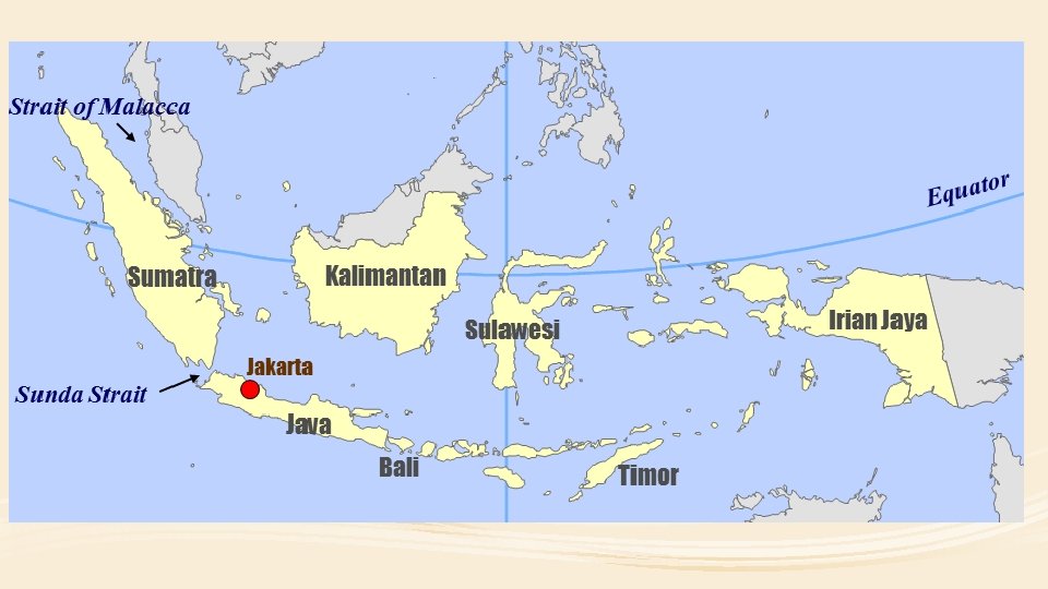 Indonesia • Regional setting From the Greek Indos (India) and Nesos (Island), literally the “Indian Islands. ” • 17, 000 islands: • • • Controls two strategic straits: • • • About 6, 000 inhabited. Longest coastline in the world. Three time zones. Coastal zones supports approximately 60% of the population. Sunda and Malacca. Through which much of the world’s oil traffic must pass. Volcanism • • Intense volcanic and seismic activity. 300 volcanoes of which 200 have been historically active