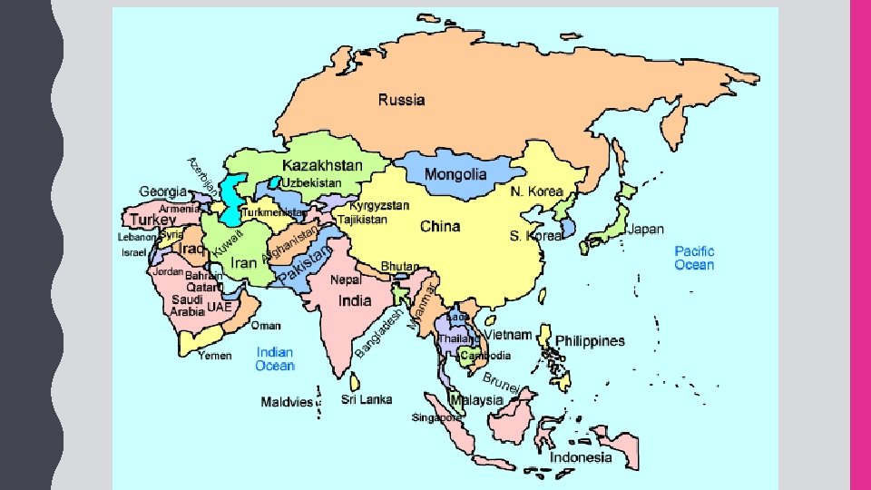 Sea of Japan: • The Sea of Japan is a small sea that is bound by Russia to the north, the Korean Peninsula to the west, and Japan to the east. • It is an arm of the Pacific Ocean that lies between the Asian continent and Japan. • The sea has large deposits of mineral resources and abundant fish, both of which are important to Japan’s economy. South China Sea: • The South China sea is located between Vietnam and the Philippines. • The South China Sea connects the Pacific and Indian oceans, so many of the world’s international shipping channels run through it. • There are often violent monsoons and typhoons in this region. Yellow Sea: • The Yellow Sea is an extension of the Pacific Ocean that lies between China and the Korean Peninsula.