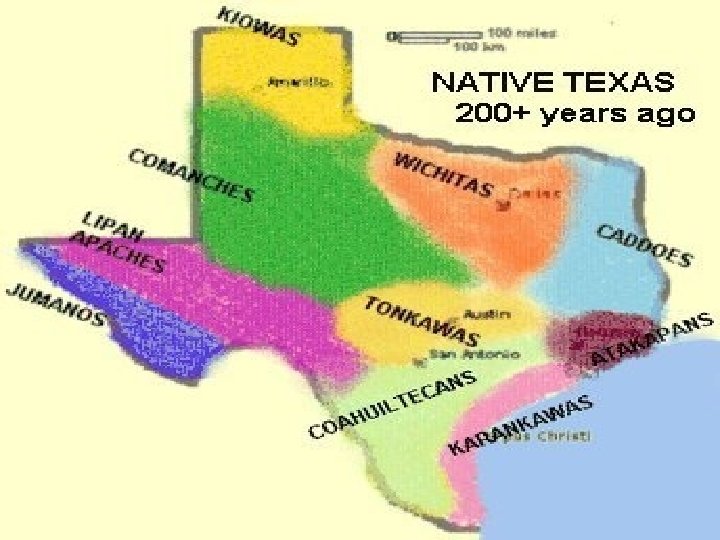 The Wichitas • • • The Wichitas moved from present-day Kansas to lands along the Trinity, Red, and Brazos Rivers. They hunted buffalo & farmed. Known for their tattoos around the eyes known as “raccoon eyes”. Women held leadership positions and shared work with the men. They traded with the French but often fought Spanish settlers, who tried to bring them into Spanish missions.