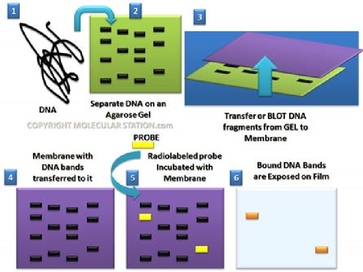 9. Washing After hybridization, the membrane is washed using SSC buffer to remove the unbounded probes, while bound probes remain attached 10. Detection limit is 0. 1 pg of the DNA. 1. Autoradiography method - If the probe is radiolabeled 32 P or fluorescent labeled, the pattern of hybridization is visualized on Xray film 2. Biotin streptavidin method - If the probe is labeled by a nonradioactive chromogenic dye, the pattern of hybridization is visualized by development of color on the membrane and measurement by colorimeter. 3. Bioluminescence method – If the probe is tagged with bioluminescent, the pattern is visualized by measuring luminesence using luminometer.