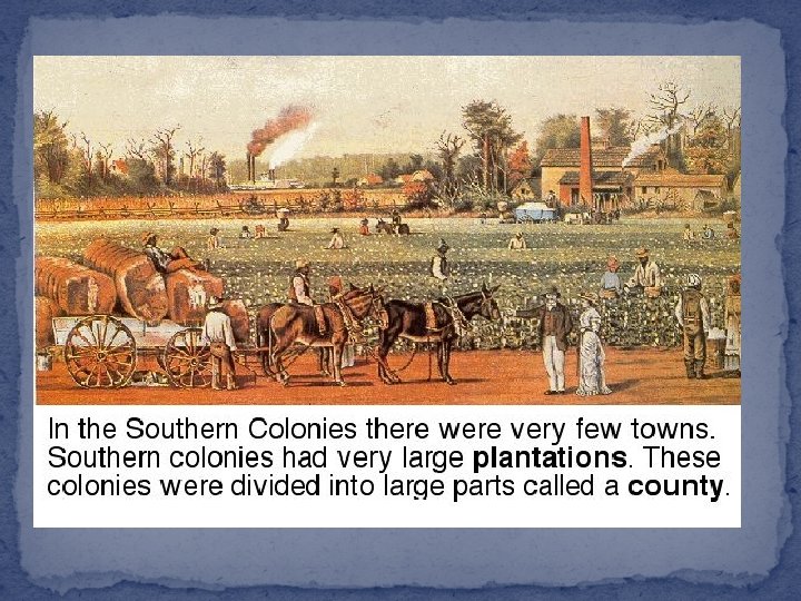 Trade Ports �Southern colonies had fewer cities than the New England Middle Atlantic Colonies. �There were more farms in the south. �Big cities in the South were near the water: Savannah (GA), Charles Town (SC), Wilmington (NC) and Baltimore (MD) �Exports = indigo, tobacco, rice �Imports = tea, coffee, spices