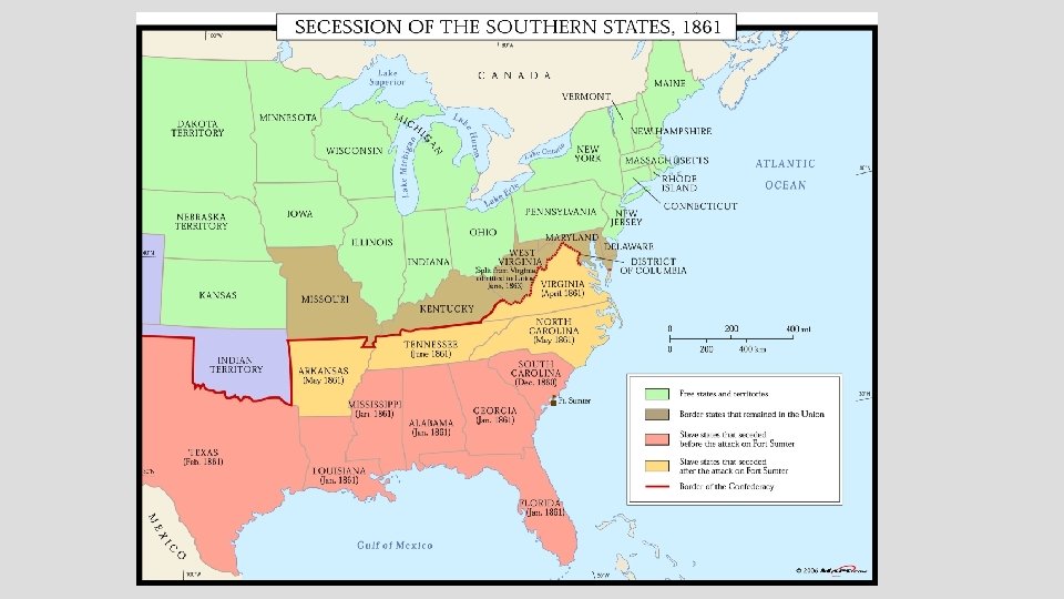 SECESSION • First Wave: South Carolina begins secession, 6 other states follow (Alabama, Mississippi, Georgia, Florida, Texas, and Louisiana) • Second Wave: Virginia, Arkansas, North Carolina, Tennessee join after the Siege of Fort Sumter. • These states come together to form the Confederate States of America (CSA) (think Articles of Confederation type government) • Border States: slave states that remained in the Union