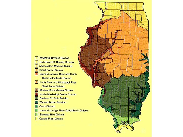 Lower Mississippi Bottomland Forests • This division includes areas near the Mississippi River and its floodplain from Alton to the Thebes Gorge. Mississippi is very muddy here due to silt load from the Missouri. Northern part had prairie, marsh and forest. Southern part was densely forested.
