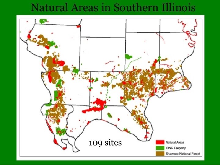 Illinois Ozarks • Forest – Almost entirely forested at time of settlement. Northern forests consist of red oak, sugar maple, basswood, and Ohio buckeye on mesic sites and white oak, black oak, and hickories on ridge tops. Beech and tuliptrees occur in the mesic forests of the central section. Forests of the southern section contain many tree species including cucumber tree, blackgum, butternut, black walnut, bitternut hickory, in addition to red oak, sugar maple, basswood, white oak, black oak, Ohio buckeye, beech and tuliptree. Yellow-wood occurs in limited areas in southern section. Some shortleaf pine in the south.