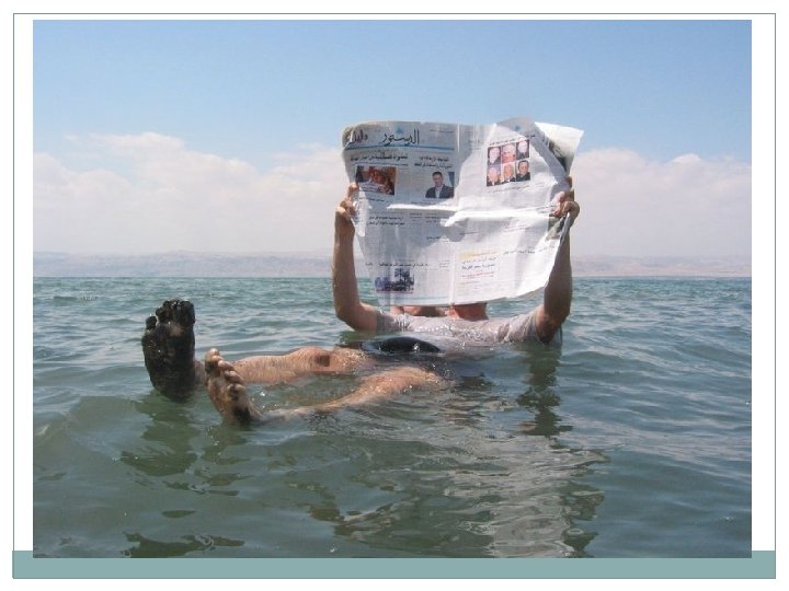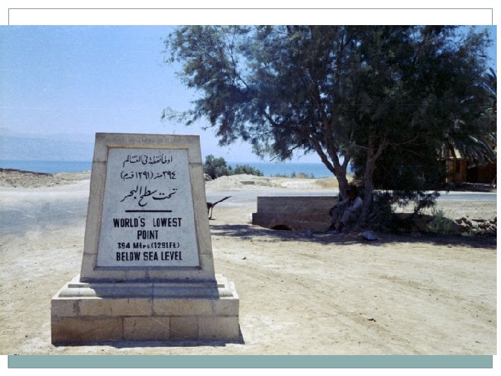 1. Dead Sea �Dead Sea landlocked, saltwater lake lowest place on the Earth’s surface at 1, 312 feet below sea level 9 times saltier than the ocean