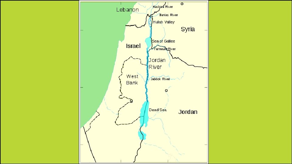 Jordan River • The Jordan River begins at the southern end of the Sea of Galilee & flows south until it reaches the Dead Sea. • This river is a main source of water for Israel, Jordan, parts of Syria, & many of those living in the West Bank & the Gaza Strip. • The Jordan River is also important because it is the political boundary between Israel, the West Bank, & Jordan.