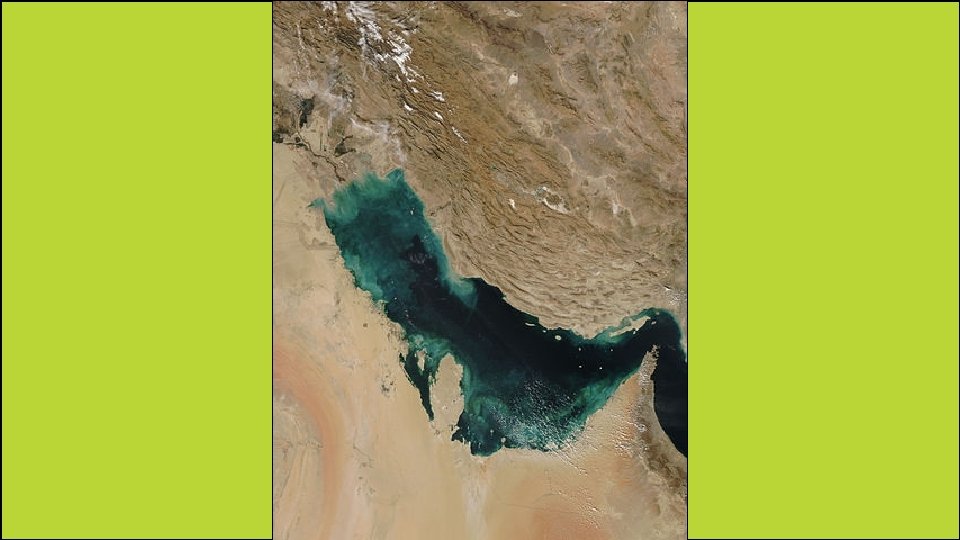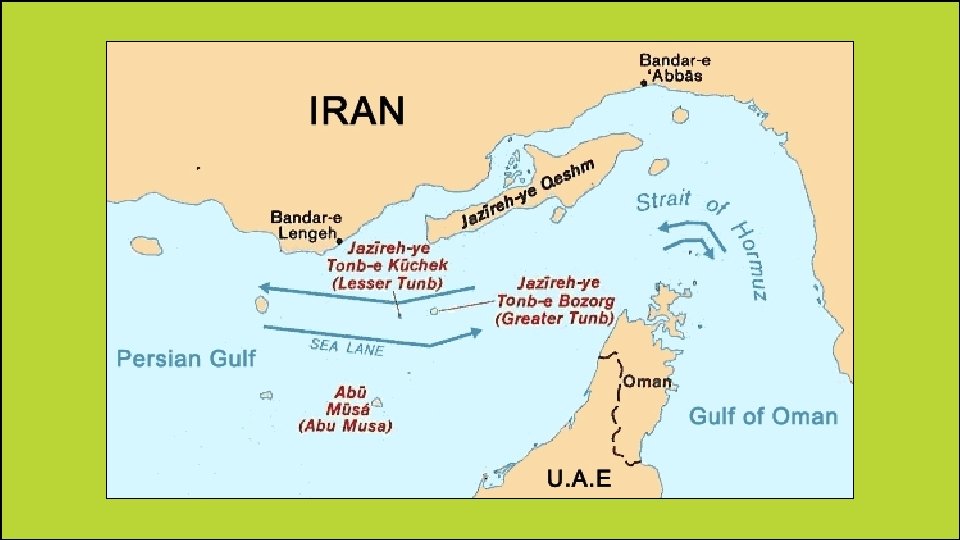 Strait of Hormuz • It is located at one end of the Persian Gulf. • It connects the Persian Gulf to the Arabian Sea. • It is very important because any ships coming out of or into the Persian Gulf must navigate through this very narrow waterway.