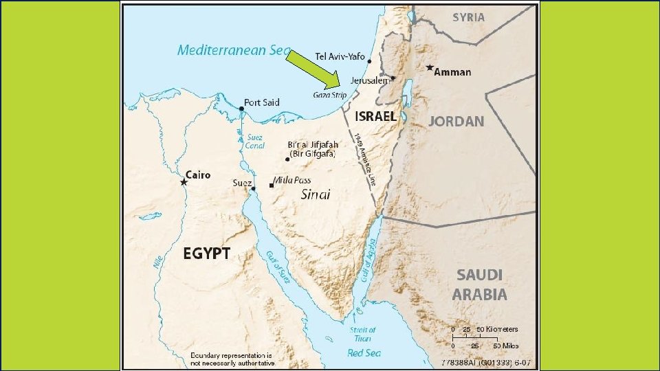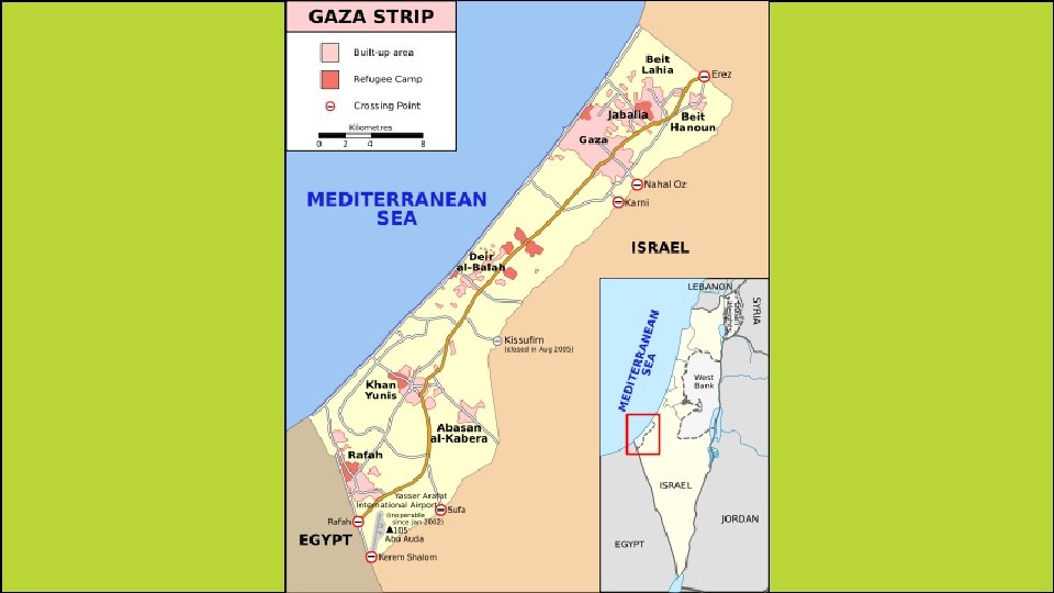 Gaza Strip • It is located along the southeastern shore of the Mediterranean Sea. • The Gaza Strip is a rectangular territory that is about 25 miles long and 4 to 5 miles wide. • It’s one of the world’s most densely populated areas. • The Gaza Strip is often politically unstable and there have been many outbreaks of violence over the last 60 years.