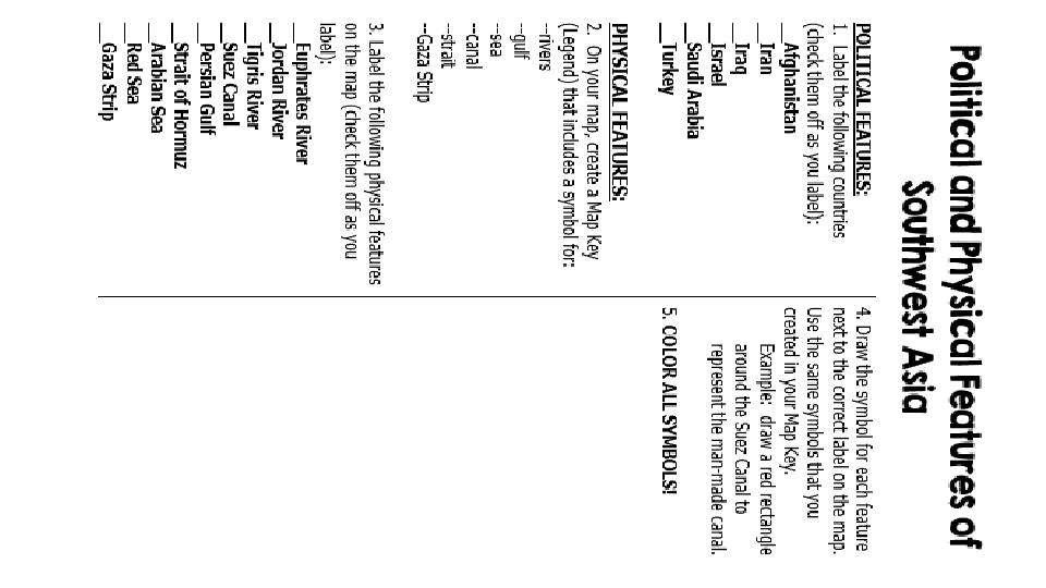 Standards SS 7 G 5 The student will locate selected features in Southwestern Asia (Middle East). a. Locate on a world and regional political-physical map: Euphrates River, Jordan River, Tigris River, Suez Canal, Persian Gulf, Strait of Hormuz, Arabian Sea, Red Sea, and Gaza Strip. b. Locate on a world and regional political-physical map the nations of Afghanistan, Iraq, Israel, Saudi Arabia, and Turkey.