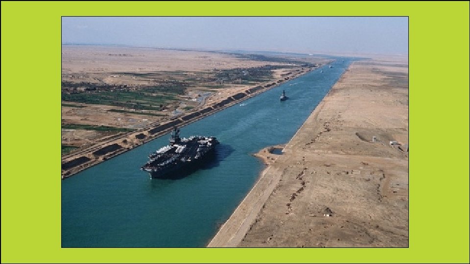 Suez Canal • This is a 120 -mile man-made waterway that is used to transport goods to and from all three continents. • The French started building it, but it was completed by the British in 1869. • It connects the Red Sea with the Mediterranean Sea. • At the northern end of the Red Sea, ships can enter the canal and can get to the Mediterranean Sea without having to sail all around the continent of Africa.