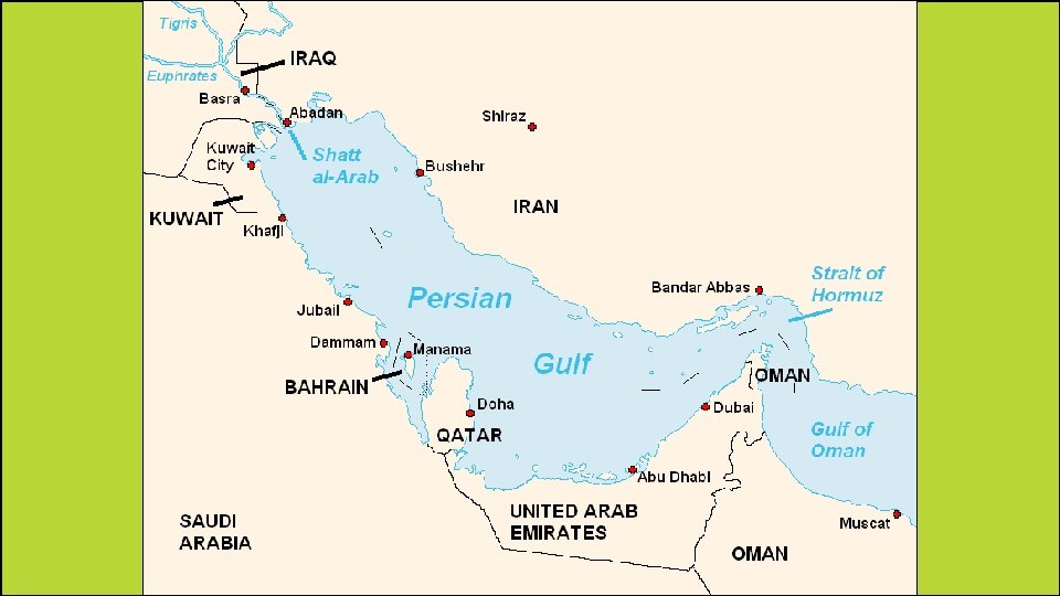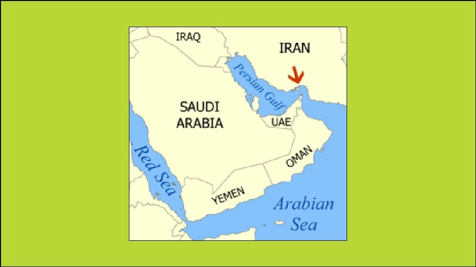 Strait of Hormuz • It is located at one end of the Persian Gulf. • It connects the Persian Gulf to the Arabian Sea. • It is very important because any ships coming out of or into the Persian Gulf must navigate through this very narrow waterway.