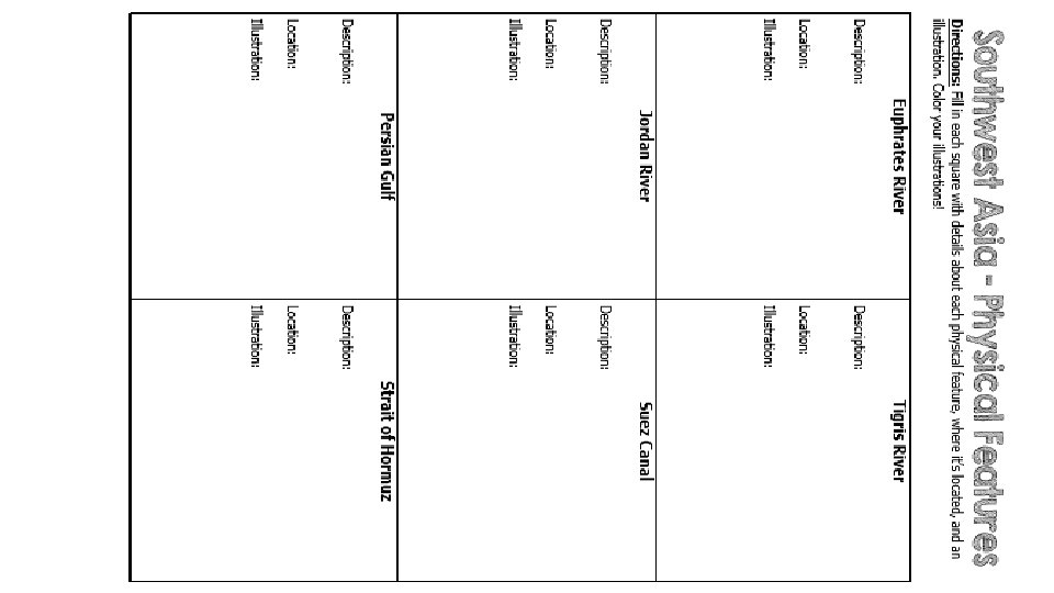 Standards SS 7 G 5 The student will locate selected features in Southwestern Asia (Middle East). a. Locate on a world and regional political-physical map: Euphrates River, Jordan River, Tigris River, Suez Canal, Persian Gulf, Strait of Hormuz, Arabian Sea, Red Sea, and Gaza Strip. b. Locate on a world and regional political-physical map the nations of Afghanistan, Iraq, Israel, Saudi Arabia, and Turkey.
