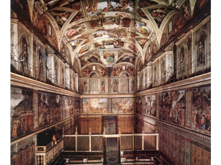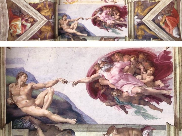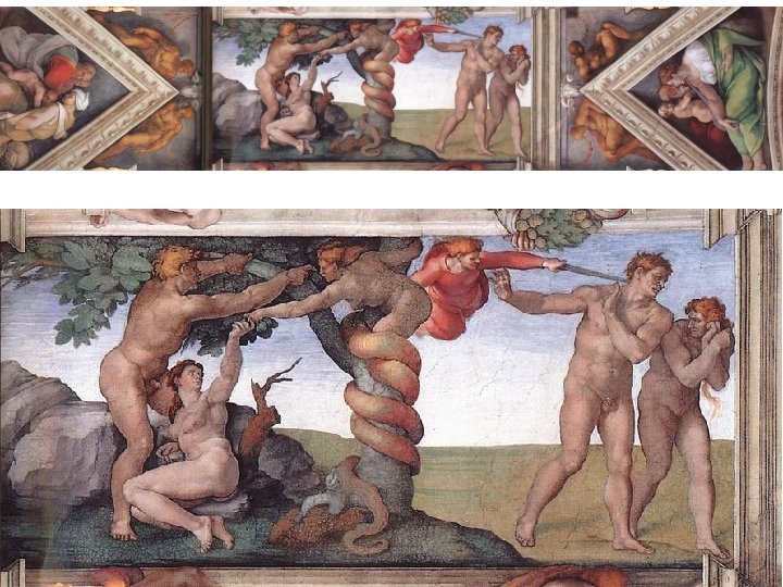 Michel Ange peintre: le plafond de la Chapelle Sixtine (1508 -1512) • Michel-Ange doit interrompre son travail sur les Esclaves pour peindre le plafond de la chapelle Sixtine, au Vatican. Il s’acquitte de la tâche en quatre ans (1508 -1512) et laisse un ensemble colossal qui surpasse, par ses dimensions et par sa cohésion, les fresques du XVème siècle. • Dans la partie centrale sont représentées neuf scènes de la Genèse (la création du monde, la création de l’homme, le Déluge etc. ). Dans les tympans sont représentés les prophètes et les sibylles. • Nous ne savons pas quelle a été la part de Michel-Ange dans la conception de ce programme, mais il correspond tout à fait à ses préoccupations…