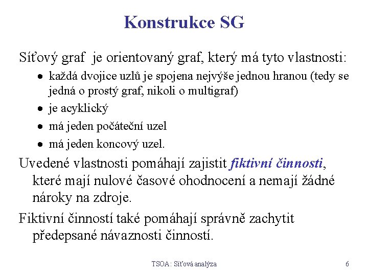 Konstrukce SG Síťový graf je orientovaný graf, který má tyto vlastnosti: · každá dvojice uzlů je spojena nejvýše jednou hranou (tedy se jedná o prostý graf, nikoli o multigraf) · je acyklický · má jeden počáteční uzel · má jeden koncový uzel. Uvedené vlastnosti pomáhají zajistit fiktivní činnosti, které mají nulové časové ohodnocení a nemají žádné nároky na zdroje. Fiktivní činností také pomáhají správně zachytit předepsané návaznosti činností. TSOA: Síťová analýza 6