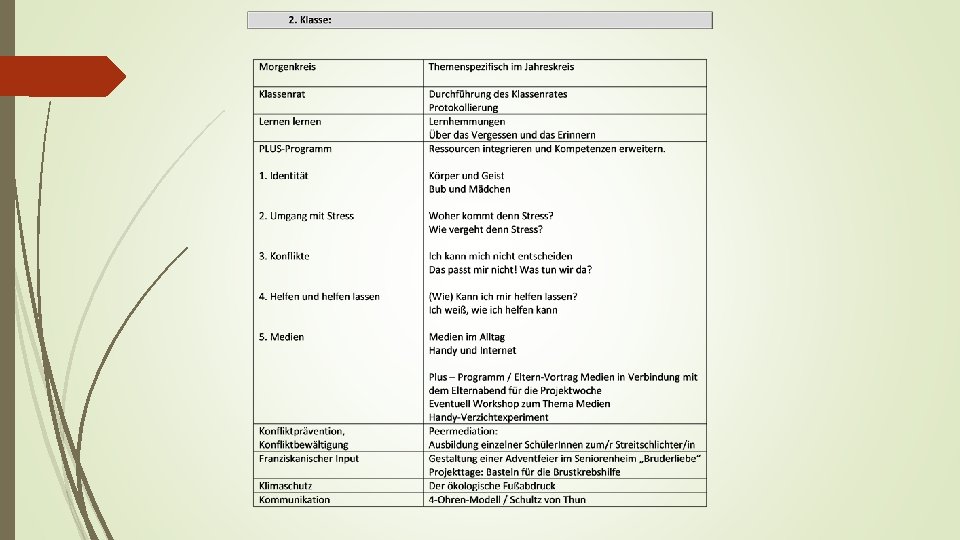 2. Klasse Soziales Lernen (1) Kids-Gym (1) Projektwoche (Natur / Umwelt) Projekte: Handy-Verzicht-Experiment Singen im Seniorenheim Bruderliebe in der Adventzeit Ausbildung zu Mediations-Peers / Streitschlichter (freiwillig)