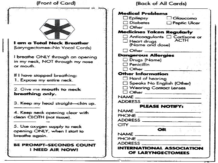 Nursing Diagnosis: Cancer of the Head and Neck • Ineffective management of Therapeutic Regimen: – Provide written instructions – Teach patient and family laryngectomy tube and stoma care – repeat teachings with return demos – Teach to cover stoma with other hygiene activities (shaving, makeup, etc. ) – Teach to report changes (stoma narrowing, difficulty swallowing, lump in throat, etc. )