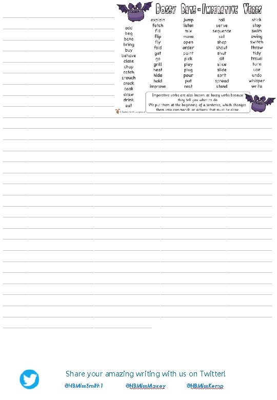 SPa. G Miss Smith and Miss Maxey’s Group Day 4 LO: to learn about imperative verbs. Imperative verbs are often called bossy verbs. Remember: a verb is an action word. A bossy verb is when you’re telling someone what to do (like you would do in instructions! 1. Circle the imperative verbs. get mix little open happy enjoy dog 2. Add the missing imperative verbs to these sentences. 3. Write your own sentences with bossy verbs in them. Extra challenge: use ‘and’ and get two bossy verbs in your sentences. e. g. : Add the sugar and mix all the ingredients together.