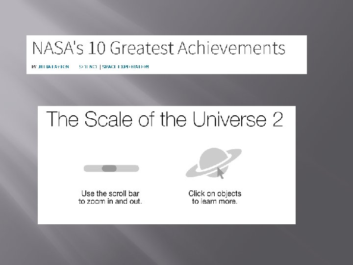 So what? � � � � 1. space exploration helps us understand our planet 2. Leads to new scientific/medical findings, useful inventions and technology. 3. 4. International collaboration (like the ISS) 4. Long-term survival (colonize other places? ? ? ) 5. Natural resources (on asteroids, the moon, etc. ? ? ) 6. National security 7. Fulfills the natural curiosity of humans to explore - Discover the answers to big ? s.
