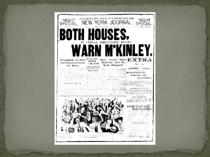 William Mc. Kinley, Jr. (1843 -1901) 25 th President Wanted to avoid war in Cuba Yellow journalism and public supported war In April 1898, President Mc. Kinley abandoned his failed diplomatic efforts and asked Congress for permission to intervene in Cuba.