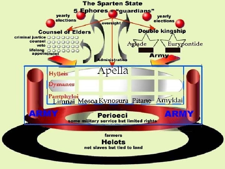 Spartan Government • 2 kings who headed the Council of Elders • Council of elders- 28 citizens over the age of 60 – Presented laws to the assembly • Assembly – all men over the age of 30 – Voted on laws presented by the council – 5 Ephors were chosen from the assembly • Enforced laws • Managed tax collection