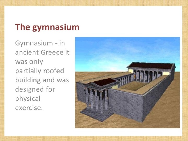 ATÉNY • Gymnáziá boli vybavené študovňami, prednáškovými sálami, knižnicami, základom však bola palaistra (zápasisko) a sály pre loptové hry a gymnastiku. Gymnázium bolo vybavené niekoľkými krytými bežeckými dráhami, nevyhnutným hygienickým zariadením vysokej úrovne – sprchy, bazény, priestory pre masáž a odpočinok. Usporadúvali súťaže.