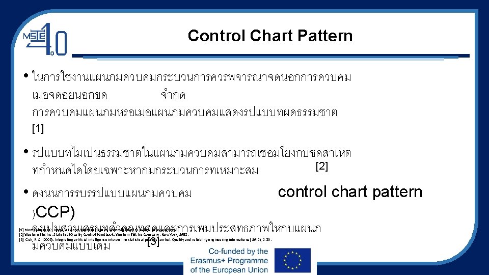 Control Chart Pattern • In the implementation of control charts, the process should be considered out-of-control when points fall outside the chart control limits, or when control charts present unnatural patterns [1] • Unnatural patterns in a control chart can be associated with a specific set of assignable causes provided that appropriate process knowledge is available [2] • Hence, control chart pattern (CCP) recognition is the most important supplement and enhancement to the conventional control charting [3] [1] Montgomery DC. Introduction to Statistical Quality Control (3 rd edn). Wiley: New York, 1996. [2] Western Electric. Statistical Quality Control Handbook. Western Electric Company: New York, 1958. [3] Guh, R. S. (2003). Integrating artificial intelligence into on‐line statistical process control. Quality and reliability engineering international, 19(1), 1‐ 20.