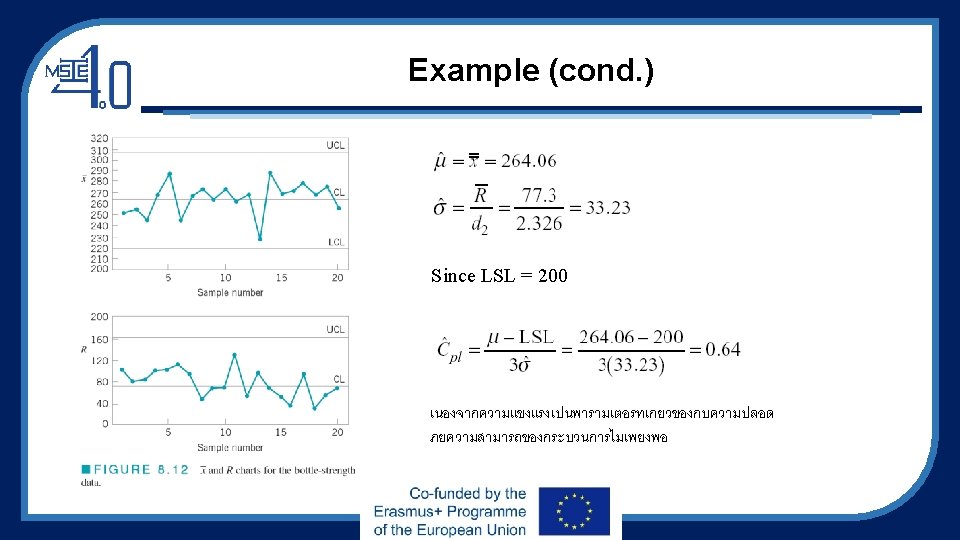Example: Process Capability Analysis using Control Charts • Table 8. 5 presents the container bursting‐strength data in 20 samples of five observations each. • The strength is controlled using LSL only, which LSL=200. • The calculations for the x and R charts are summarized here: