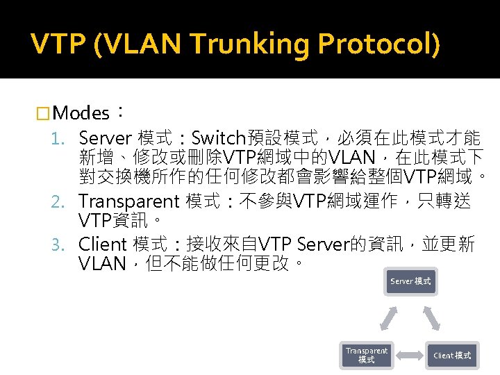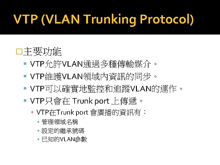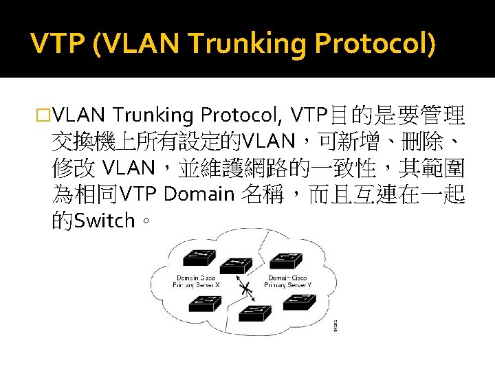 VTP (VLAN Trunking Protocol) �VTP Pruning p 在Switch中,我們還可以啟動VTP Pruning功能, 以刪除不必要的flooded traffic 的資訊通過其它的 Switch,以節省頻寬,增加整體網路效能。