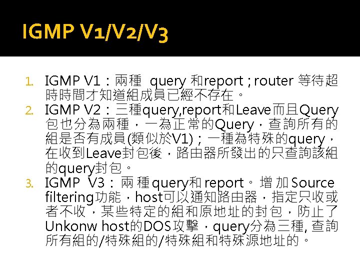 IGMP (Internet Group Management Protocol) �主要是用來定義如何在Layer 3建立multicast group,這個protocol不是用來傳送資料用 的,專門用來建立與管理multicast group 。 p D class (224. 0. 0. 0 ~ 239. 255) 是用來做multicast group