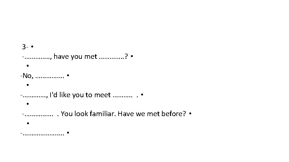 More Practices: • • 1 -are/how/you • a-Hi Maryem. -------- -----? • Thanks/fine • b- ------, Eddie. And you? • Ok/thank/ I'm • a- --------- you. •