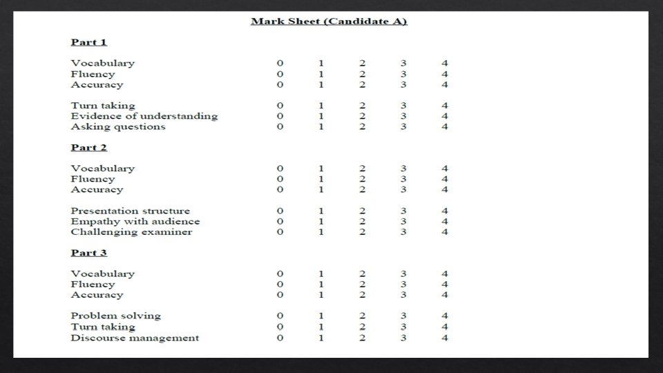 Test overview Question 1 Interaction between two candidates Question 2 Each candidate makes a presentation Candidate discussion Discussion with examiner Question 3 Candidates interact to solve problem